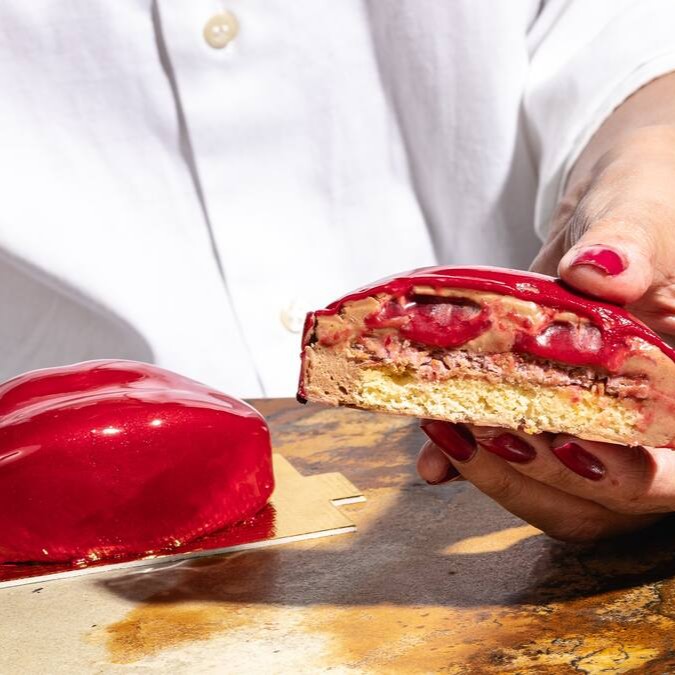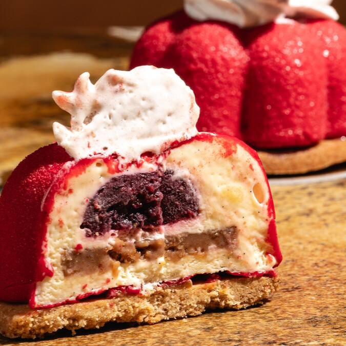 Mousse de baunilha, gelée de frutas vermelhas, chantilly de morangos, praliné crocante com toque de avelã e sablée.