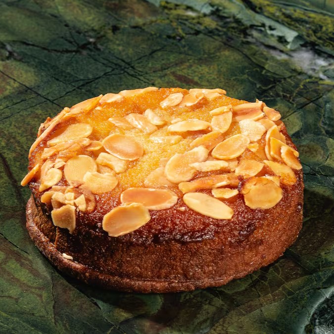Deliciosa fatia de brioche embebedado de xarope de amêndoas, coberta com creme de amêndoas e amêndoas laminadas.