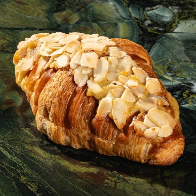 Croissant feito com farinha e manteiga francesas, recheado com creme de amêndoas e coberto com amêndoas laminadas. Crocante e cremoso... Hmmm