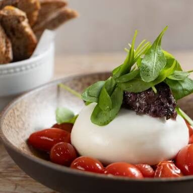 Tenra mussarela de búfala com tomates confitados, tapenade de azeitonas e finalização com mini rúcula e azeite de manjericão. Acompanha deliciosas fatias de pães de fermentação natural.