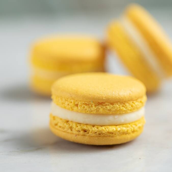 O tradicional macaron francês feito com farinha de amêndoas e delicioso recheio de limão siciliano e chocolate belga branco.