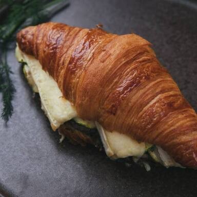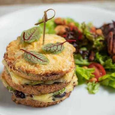 Sanduíche no brioche integral com lâminas de zucchini, cogumelos, queijo gruyère e molho bechamel, gratinado com parmesão. Acompanha batata frita ou salada.