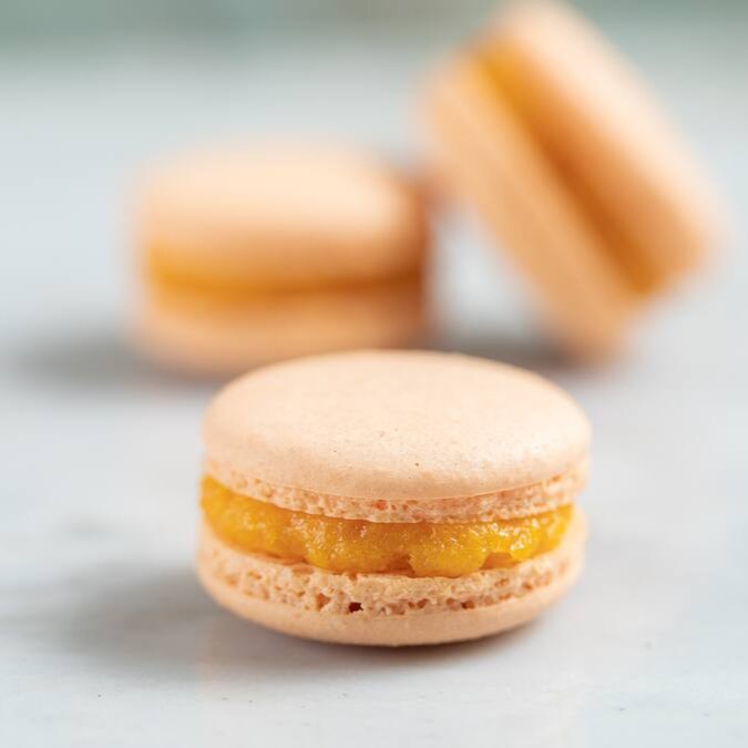 O tradicional macaron francês feito com farinha de amêndoas e delicioso recheio de pasta artesanal de damasco, sem glúten e sem lactose.