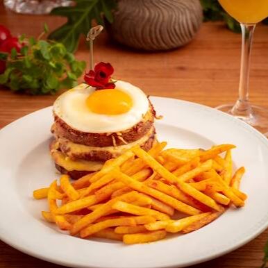Sanduíche no brioche com presunto, queijo gruyère e molho bechamel, gratinado com parmesão e ovo com gema mole por cima. Acompanha batata frita ou salada.