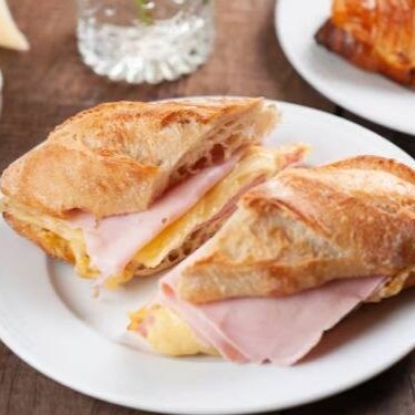 Sanduíche de presunto cozido, queijo gruyère e mostarda dijon.