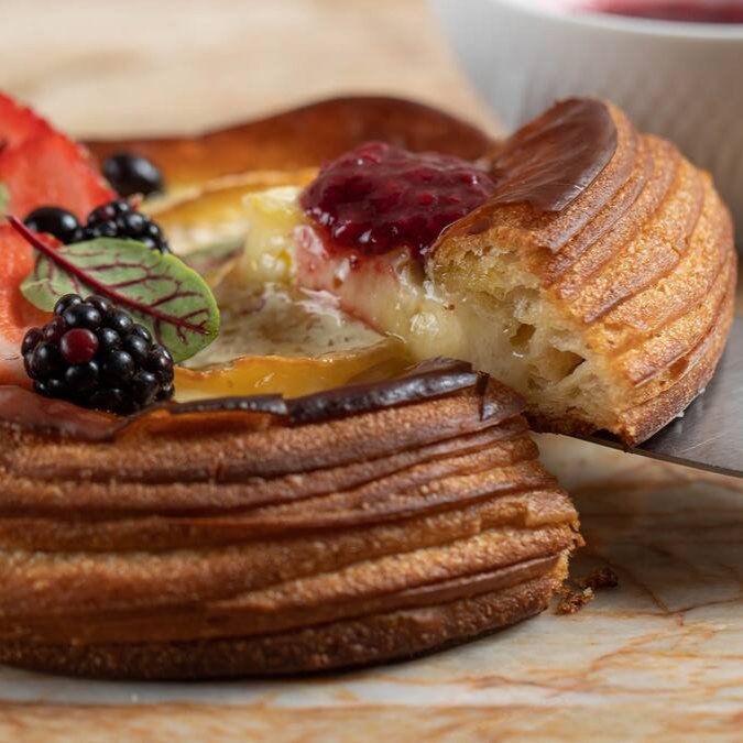 Queijo brie assado em massa folhada, servido com frutas vermelhas.