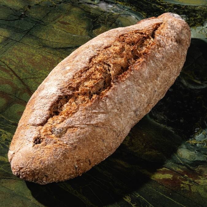 Pão 100% integral feito com farinha francesa, frutas secas e fermentação natural.