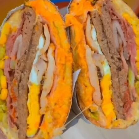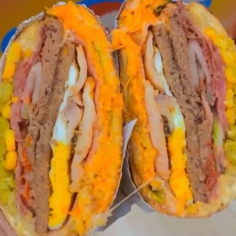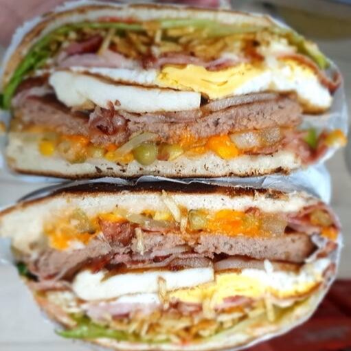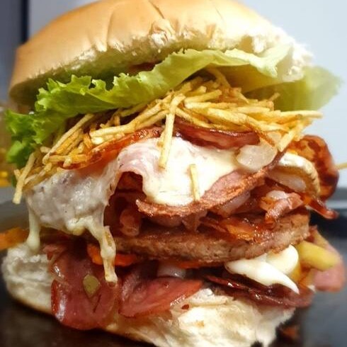 Hambúrguer 90g, Bacon, filé de frango ,calabresa,ovo,presunto ,queijo, Cheddar,Catupiry,milho ,ervilha, tomate,cebola,batata palha e alface.