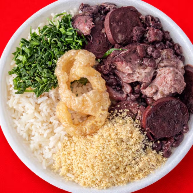 Feijoada com calabresa, carne, couve, torresmo e farofa.