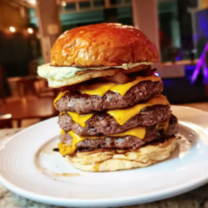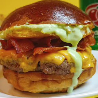 Maionese de ervas finas, 3x Delicioso hambúrguer Angus de 160g cada, Queijo cheddar fatiado, Fatias de bacon crocante, ovo frito, pão de brioche