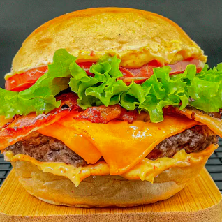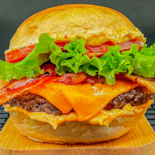 Maionese especial, Delicioso hamburguer angus de 160g, Queijo cheddar fatiado, bacon, Alface americana, Tomate, Pão de brioche.