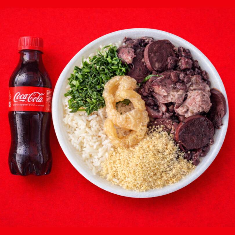Acompanha: Arroz, Feijoada com Lombo, Paio, Linguiça Calabresa, Carne Seca, Farofa e Vinagrete! + Coca Cola 200ml a preço de custo, super desconto!