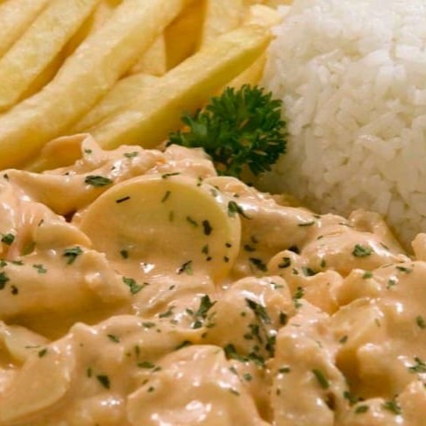 Strogonoff de frango: Acompanha, Arroz branco, Strogonoff de frango e batata frita. (Aprox.500g