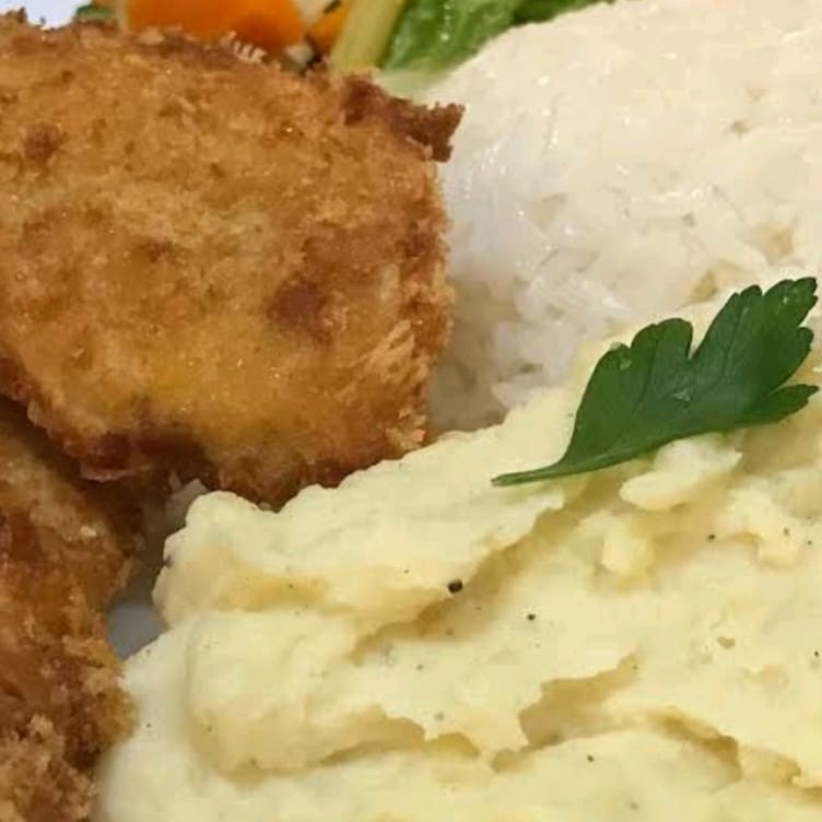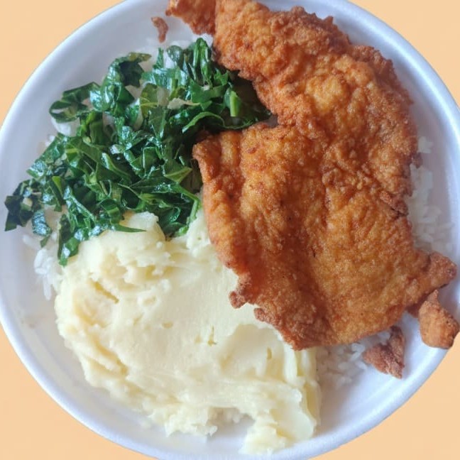 Nosso delicioso Filé de Frango à Milanesa, com a crocância perfeita, servido com um cremoso Purê de Batata, o toque verde da Couve Refogada no alho e o tradicional Arroz com Feijão Carioca fresquinho.