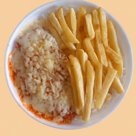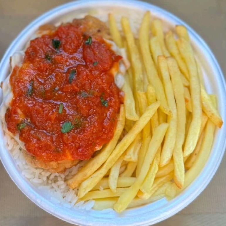 Parmegiana de Frango suculenta, coberta com molho e queijo derretido que estica, servida com Arroz soltinho e Feijão Carioca temperado, e aquela Batata Frita sequinha e crocante. ATENCAO ******(SEM FEIJAO)********