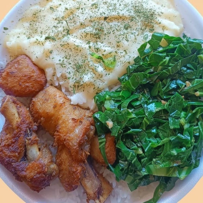Arroz branco soltinho, feijão carioca, purê de batata, couve refogado e nosso Delicioso frango a passarinho frito.