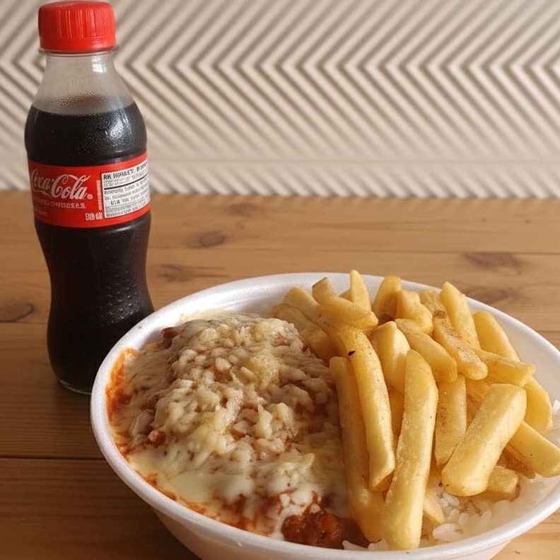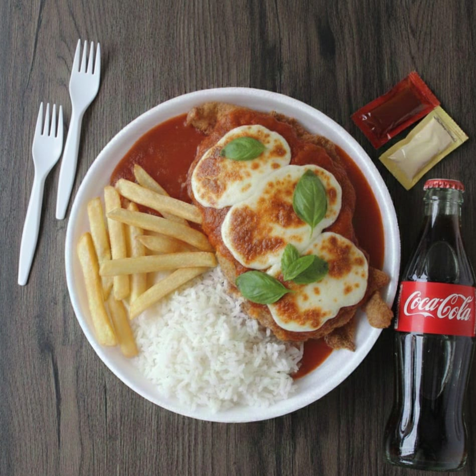 ATENCAO ******(SEM FEIJAO)********.Parmegiana dos Sonhos: Bife de Frango suculento, empanado na perfeição, afogado em um delicioso molho vermelho caseiro e coberto com uma generosa camada de queijo muçarela derretido e gratinado. Acompanha arroz soltinho e batatas fritas crocantes. Refresco Clássico: Uma gelada Coca-Cola PET 200ml para acompanhar e completar a sua refeição com aquele sabor inconfundível. Economize 45% e garanta a melhor combinação do dia! Peça já a sua antes que acabe! 🏃💨