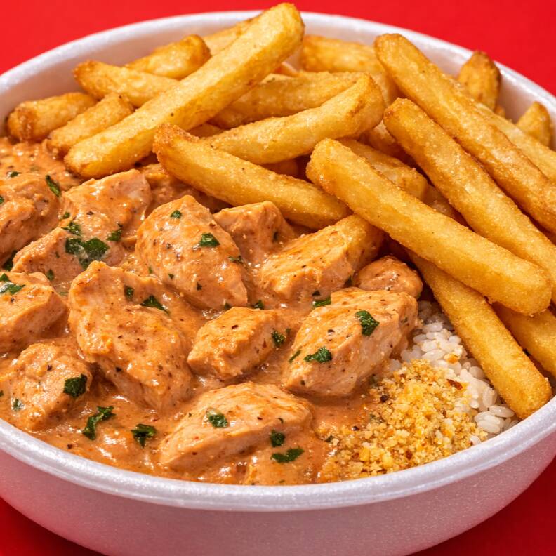 Strogonoff De Frango Com Batata Frita E Farofa+ 18.90 Leve Outra