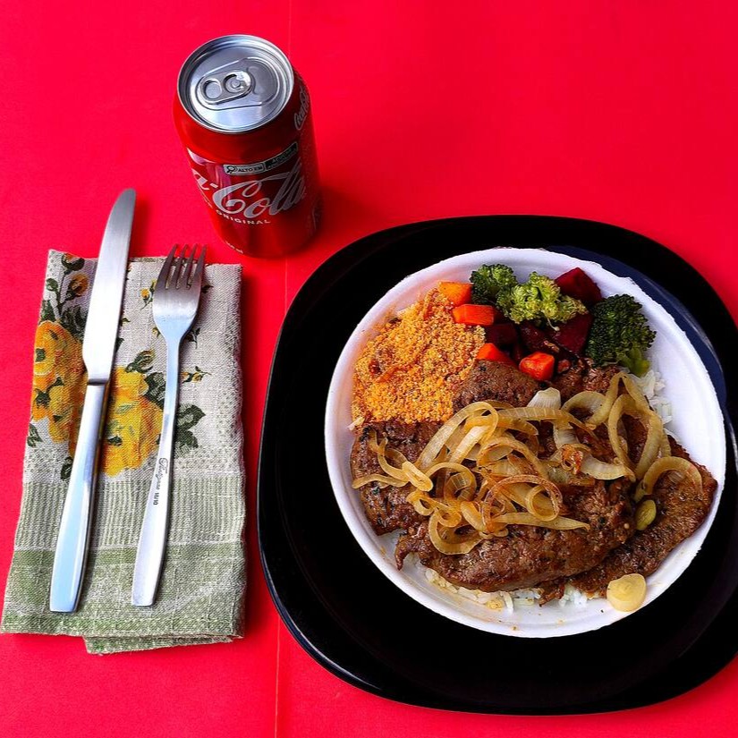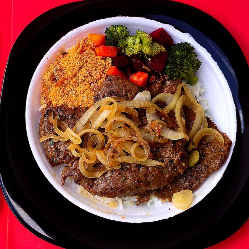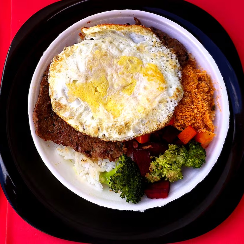 Uma refeição completa, saborosa e com gostinho de comida caseira! Acompanha um suculento bife grelhado na hora, coberto com um ovo frito, servido com arroz branco soltinho, feijão temperado. Ideal para quem busca sabor e sustância na hora do almoço!
