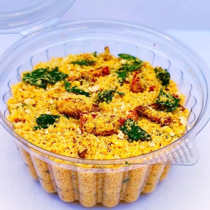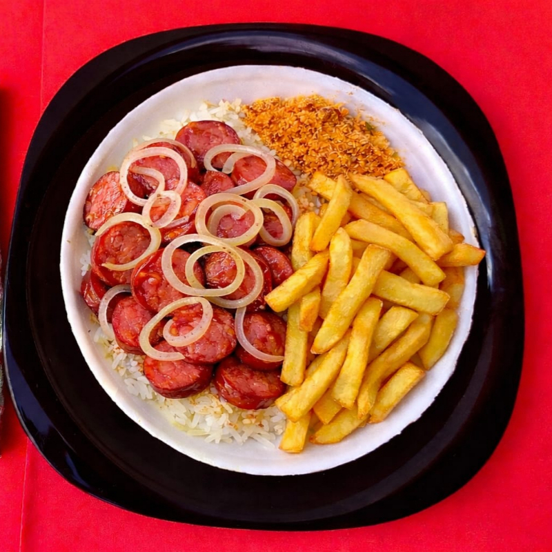 Marmita de calabresa acebolada acompanhada de arroz soltinho, feijão fresquinho, legumes mistos, farofa crocante e fritas douradas. Simples, completa e cheia de sabor.