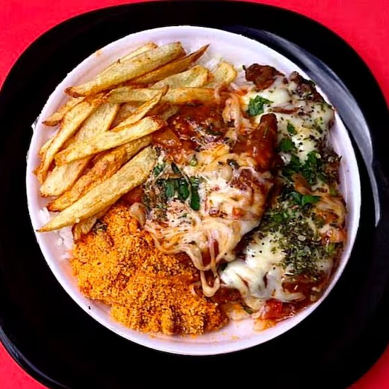 Suculento filé de frango empanado, dourado à perfeição, coberto com um generoso molho de tomate caseiro e uma camada gratinada de queijo derretido. Servido quentinho, com aroma irresistível e sabor que conquista a cada garfada. Acompanha arroz branco soltinho e batatas fritas crocantes (opcional).
