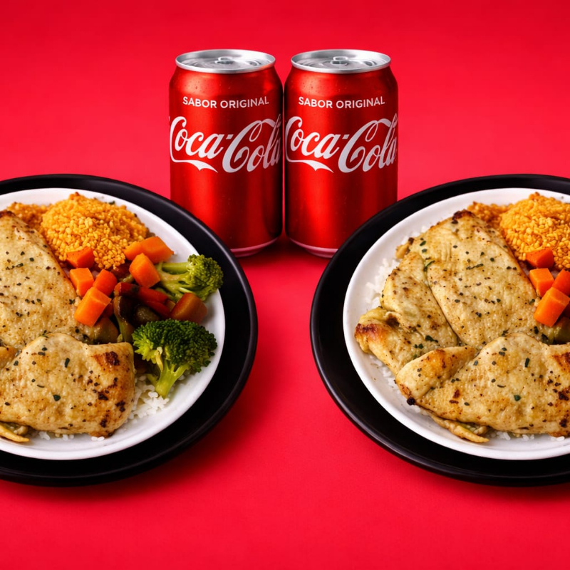 Acompanha duas marmitas P + 2 Refri e acompanhamentos a sua escolha.