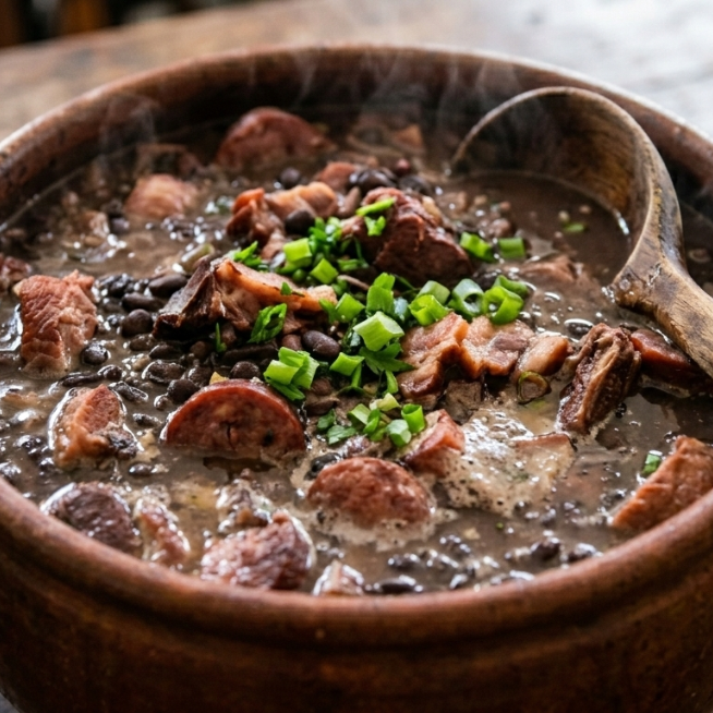 Feijoada, feita com feijão preto, carnes variadas e acompanhamentos tradicionais como arroz, farofa e vinagrete.