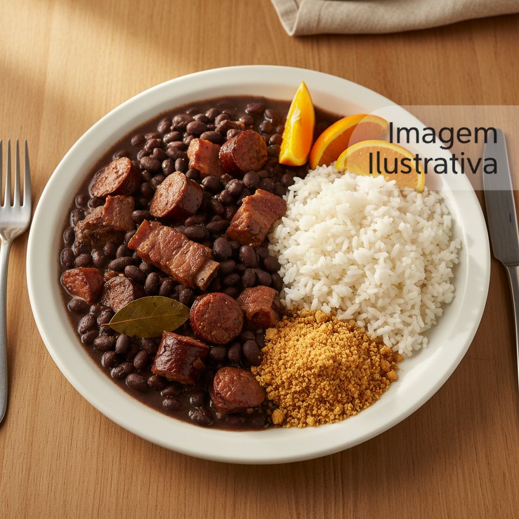 Feijoada, feita com feijão preto, carnes variadas e acompanhamentos tradicionais como arroz, farofa e vinagrete.