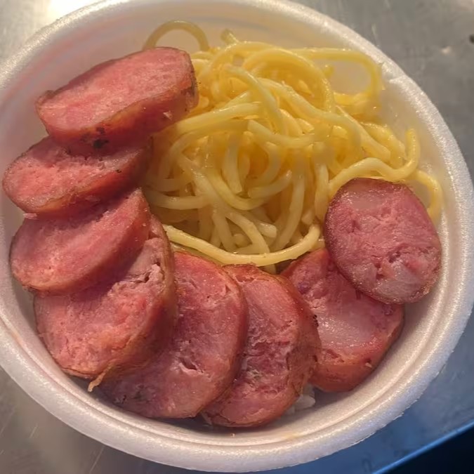 Arroz, Feijão, Farofa, Macarrão e Linguiça. Apróx de 300g á 500g.