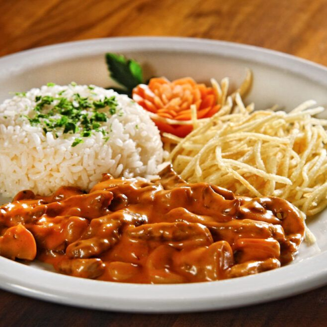 arroz, strogonoff de carne e batata palha.