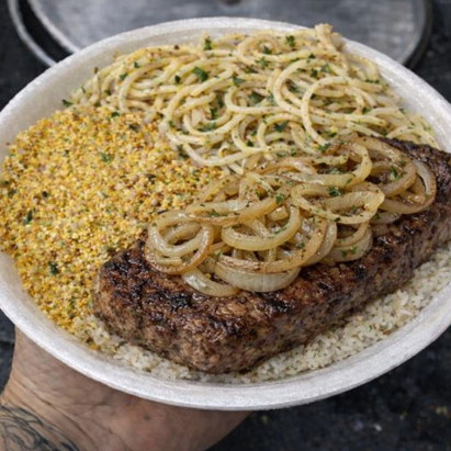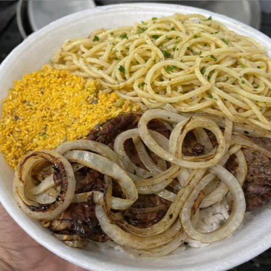 Esse Combo Acompanha Marmita: Arroz, Feijão, Contra Filé Acebolado e Batata Frita.