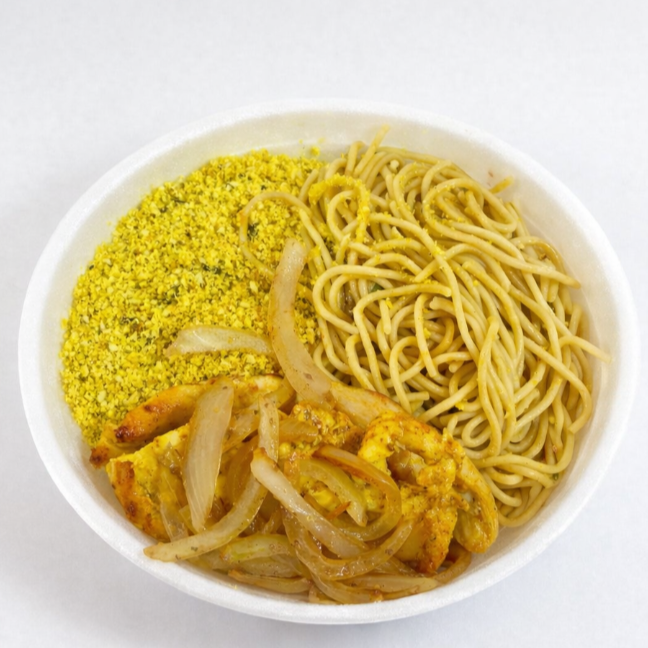 Arroz, Feijão, Filé de Frango á Milanesa, Farofa e Macarrão. Apróx 300g.