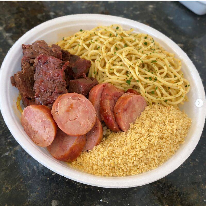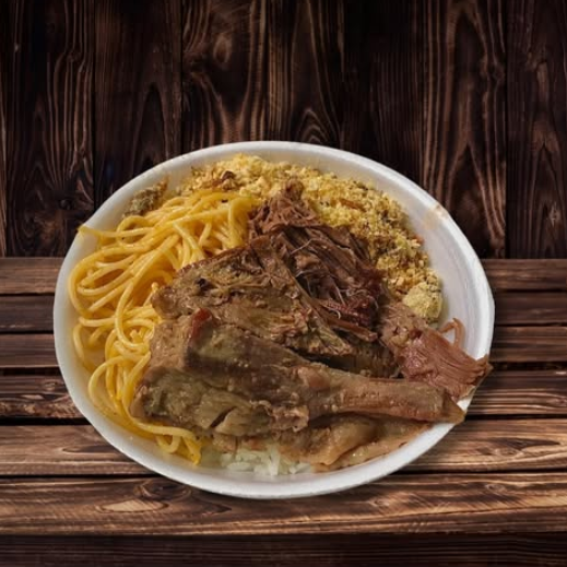 Essa Marmitex Acompanha: Arroz, Feijão, Costela, Linguiça, Macarrão e Farofa. Tamanho M.