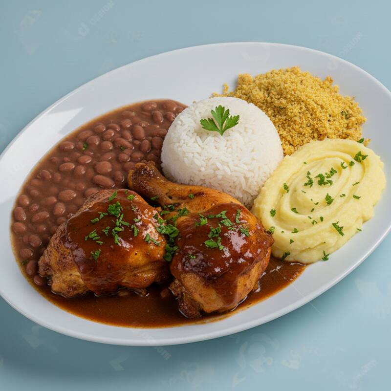 Marmitex composta de: arroz, feijão, frango assado com molho especial, purê de batata e farofa da casa.