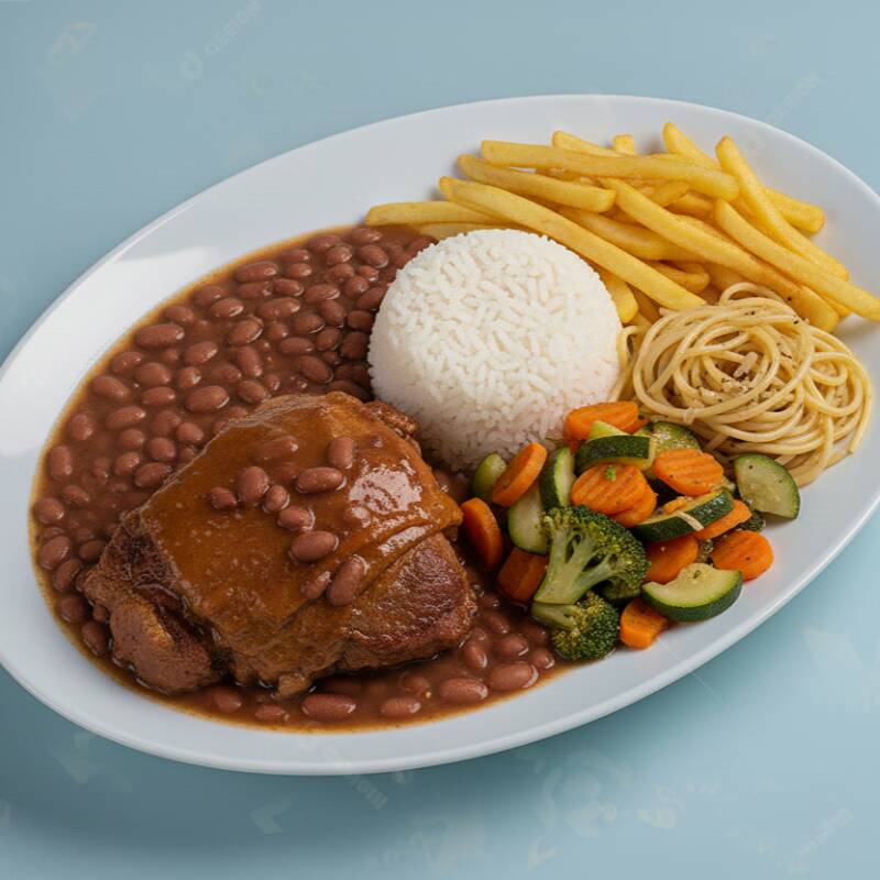 Monte a marmitex do seu jeito com 800g, escolha 2 carnes/proteínas e 3 guarnições/acompanhamentos, já acompanha arroz e feijão!