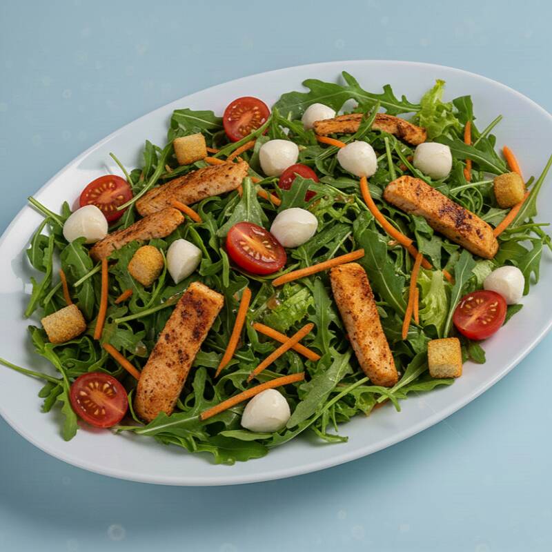 Salada acompanhada com rúcula, alface, cenoura, tomate, mussarela, croutons e pedaços de frango.
