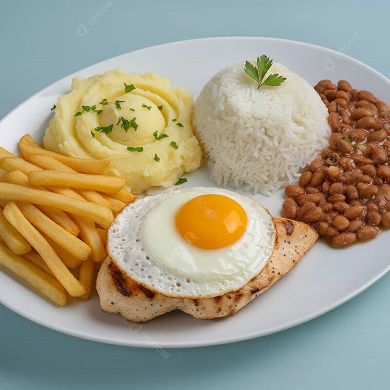 Marmitex Filé De Frango E Ovo (400g) C Purê De Batata, Fritas, Arroz E Feijão