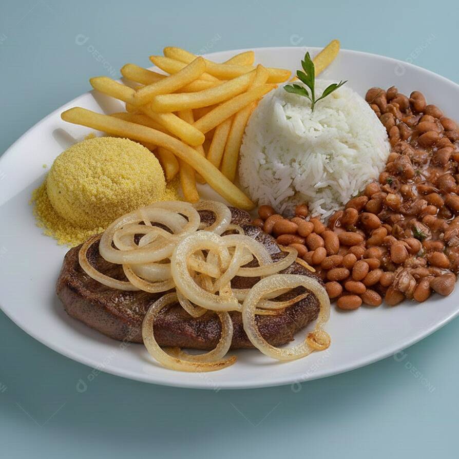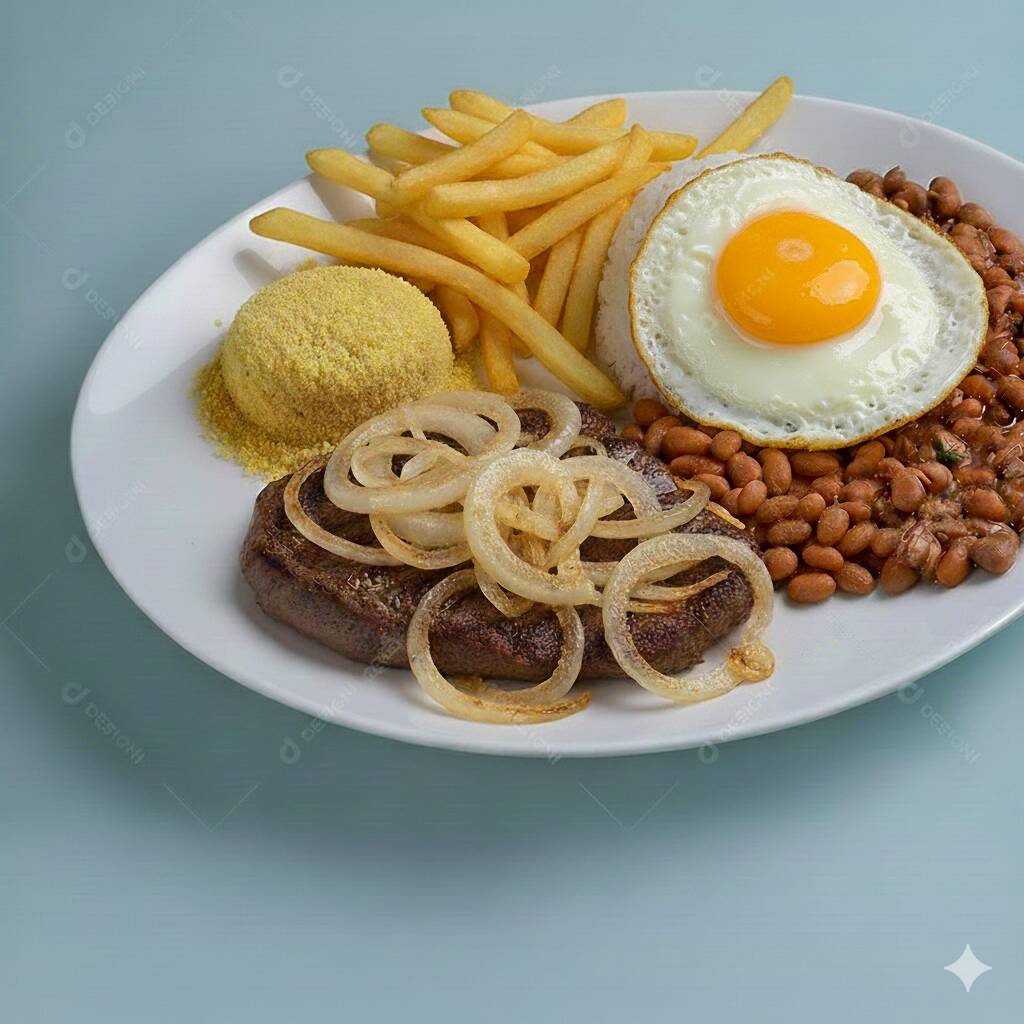 Marmitex composta de: arroz, feijão, bife acebolado, ovo frito, farofa e batata frita.