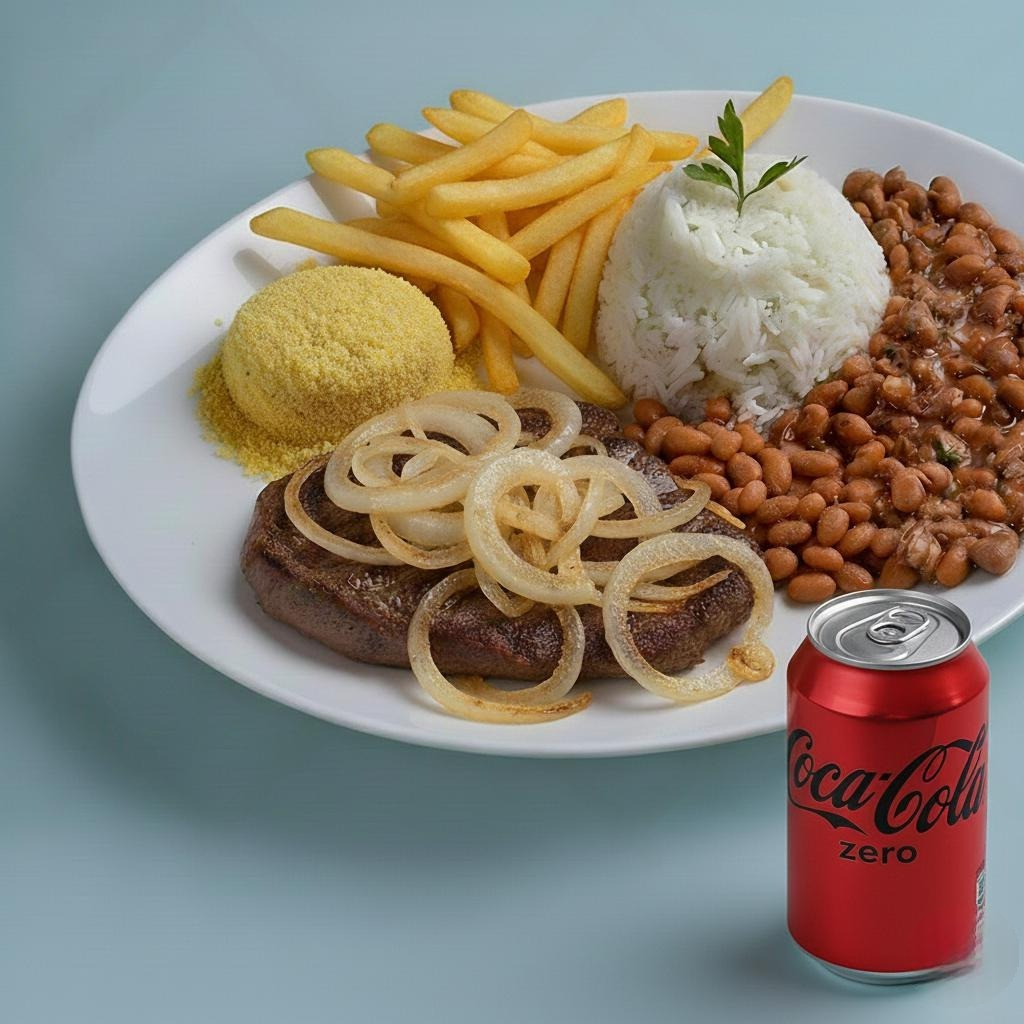Marmitex composta de: arroz, feijão, bife acebolado, farofa e batata frita. Acompanha coca cola zero lata 350ml