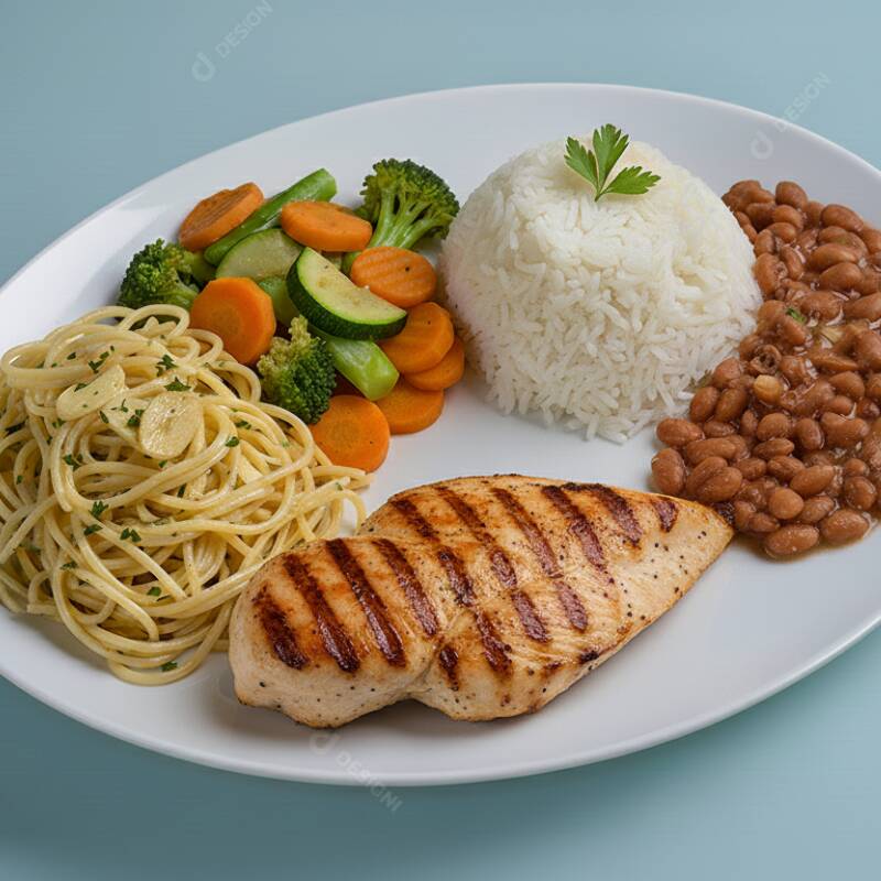 Marmitex Filé De Frango Grelhado (400g) C Legumes, Macarrão, Arroz E Feijão