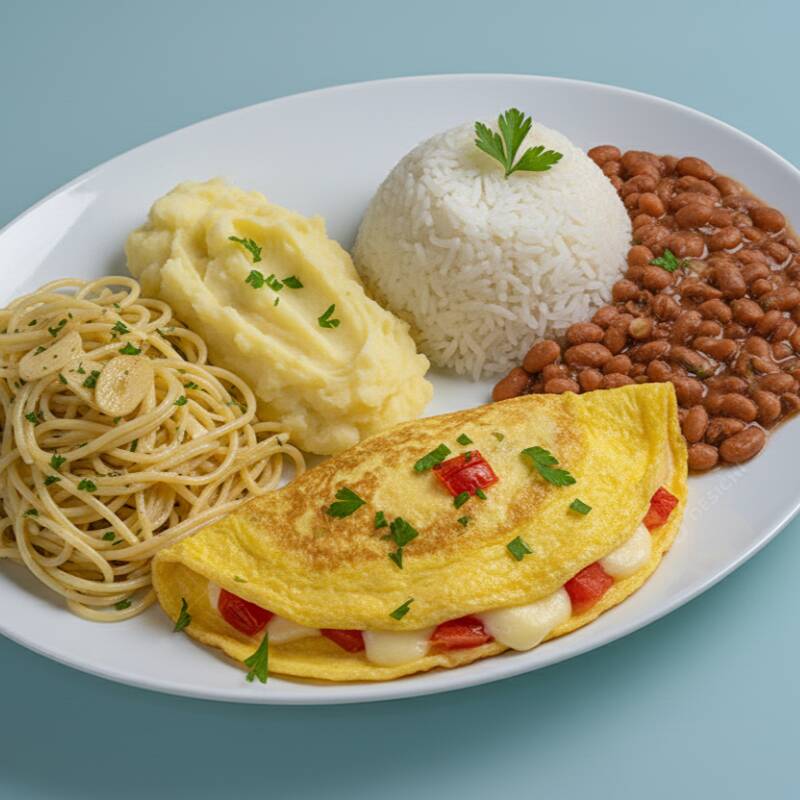 Marmitex Omelete De Queijo E Tomate (400g) C Purê, Macarrão, Arroz E Feijão