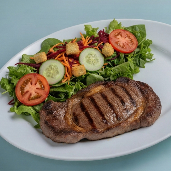 Carne grelhada e salada composta por: mix de folhas, cenoura, beterraba, tomate, pepino e croutons.