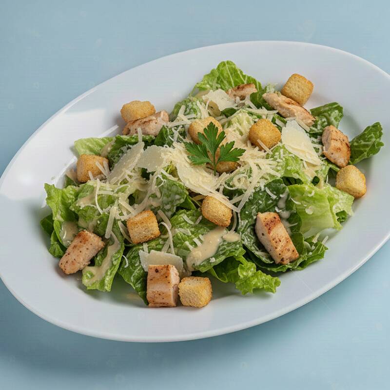 Salada ceasar com alface, croutons, pedaços de frango e parmesão