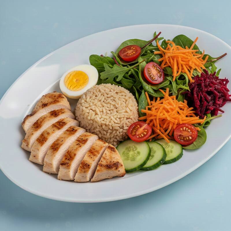 Marmitex fitness com 400g composta de arroz integral, ovo cozido, salada de folhas, tomate, cenoura ralada, pepino e beterraba ralada.