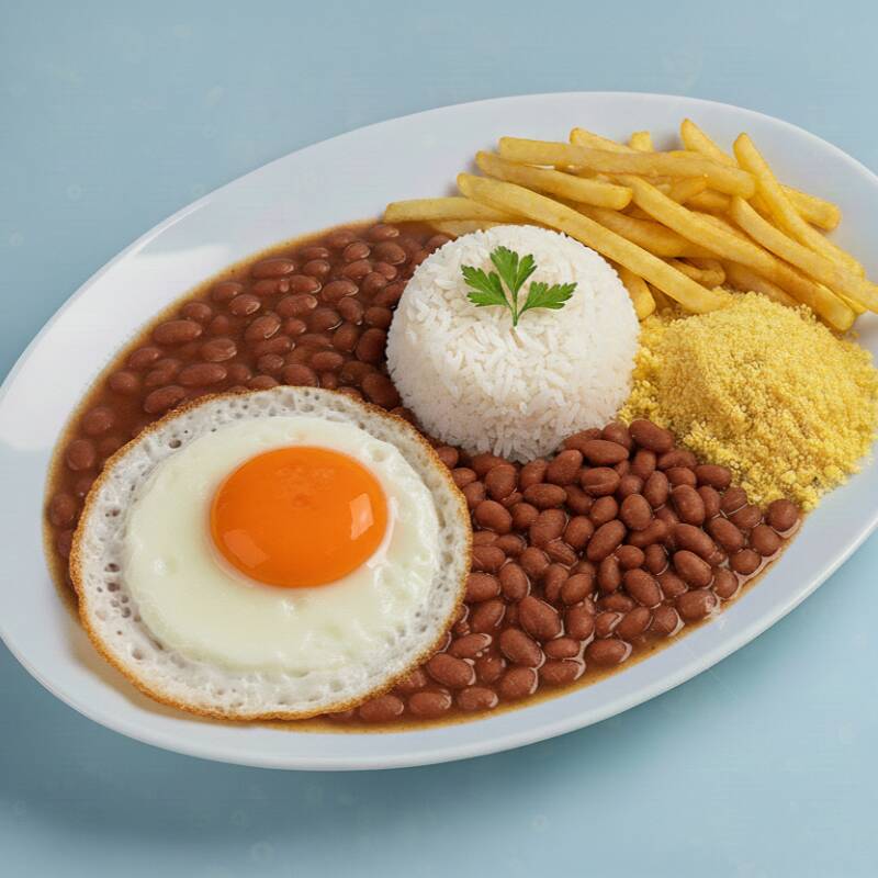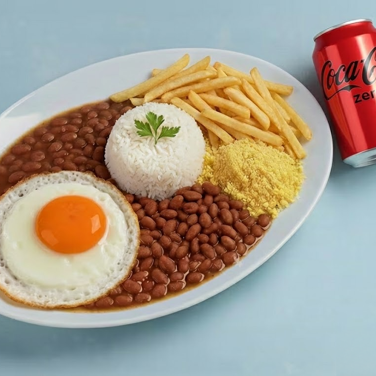 Marmitex composta de: arroz, feijão, ovo frito, farofa da casa e batata frita. Acompanha coca cola zero lata 350ml