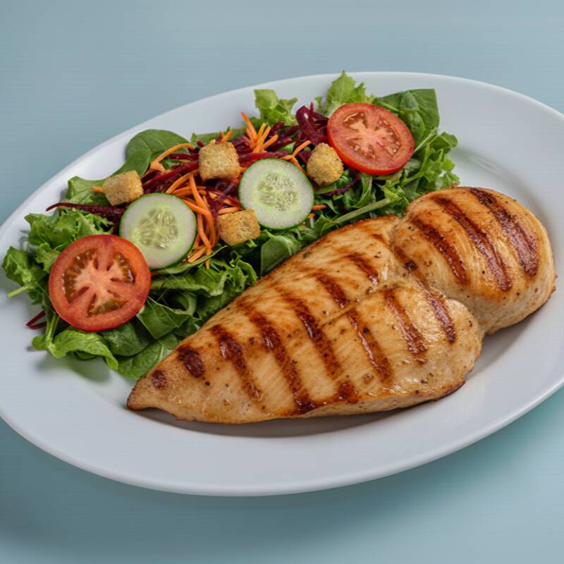 Filé de frango grelhado com salada composta por: mix de folhas, cenoura, beterraba, tomate, pepino e croutons.