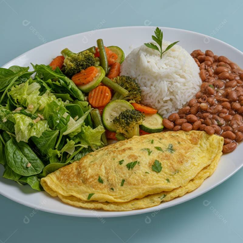 Marmitex composta de: arroz, feijão, omelete, salada de folhas e legumes do Dia.