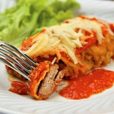 Delicioso bife à parmegiana, acompanha arroz, feijão caseiro, batata assada e farofa caseira.