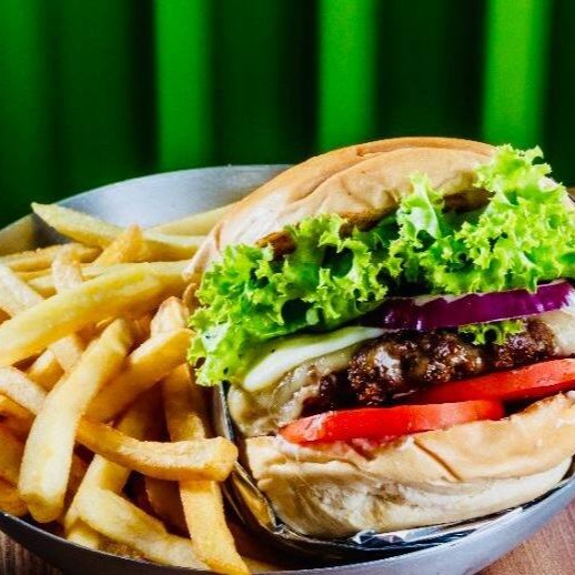 Burguer de 160g de Fraldinha artesanal, pão de Burguer, queijo, alface, tomate, cebola roxa, maionese grill e molho da casa.