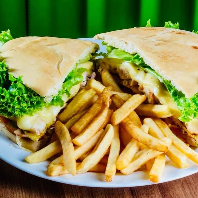 Pão sírio, filé de frango fatiado, queijo prato, Catupiry, tomate, cebola, alface, maionese, molho especial.